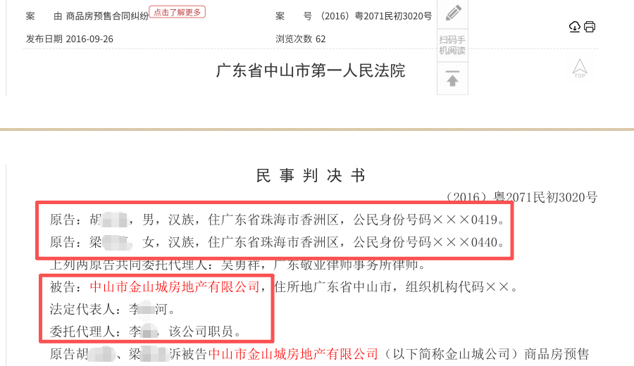 裁判文书网公示的《民事判决书》(2016)粤2071民初3020号显示,该案为“商品房预售合同纠纷”案件。原告方为胡某和梁女士;被告方为中山市金山城房地产有限公司,法定代表人李某某。