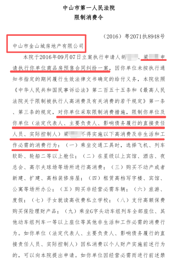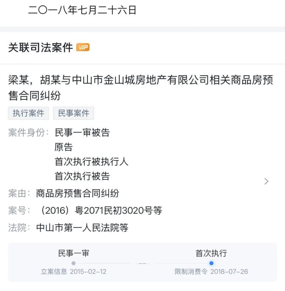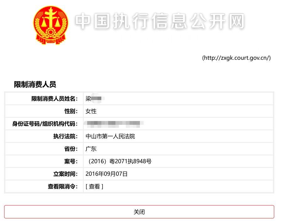 根据中国执行信息公开网查询,梁女士涉及的案件案号为“(2016)粤2071执8948号”。限制消费令的接收单位为“中山市金山城房地产有限公司”。